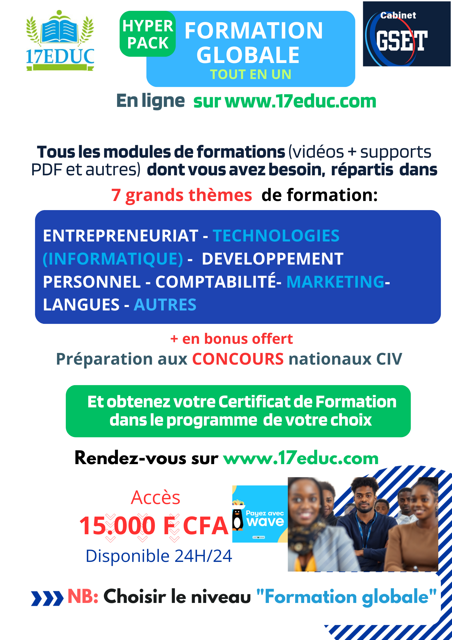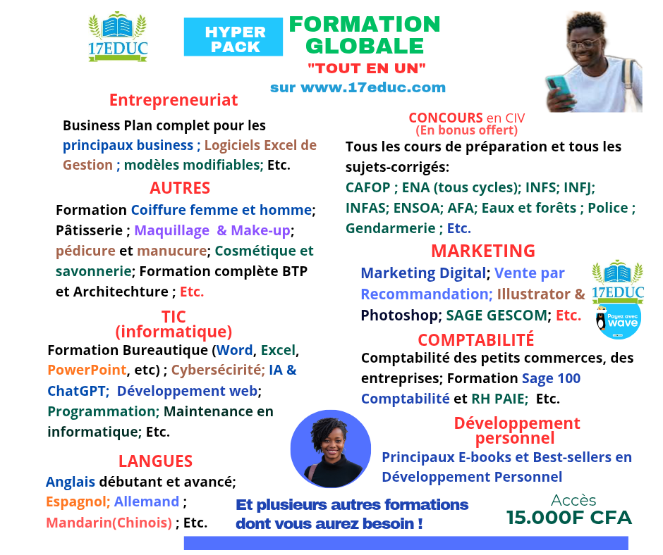 Nous vous offrirons bientôt une Formation globale en ligne, dans l'entreprenariat, la Vente, les Langues étrangères, La Comptabilité, Le E-commerce, Les TIC, La Communication et bien d'autres domaines.