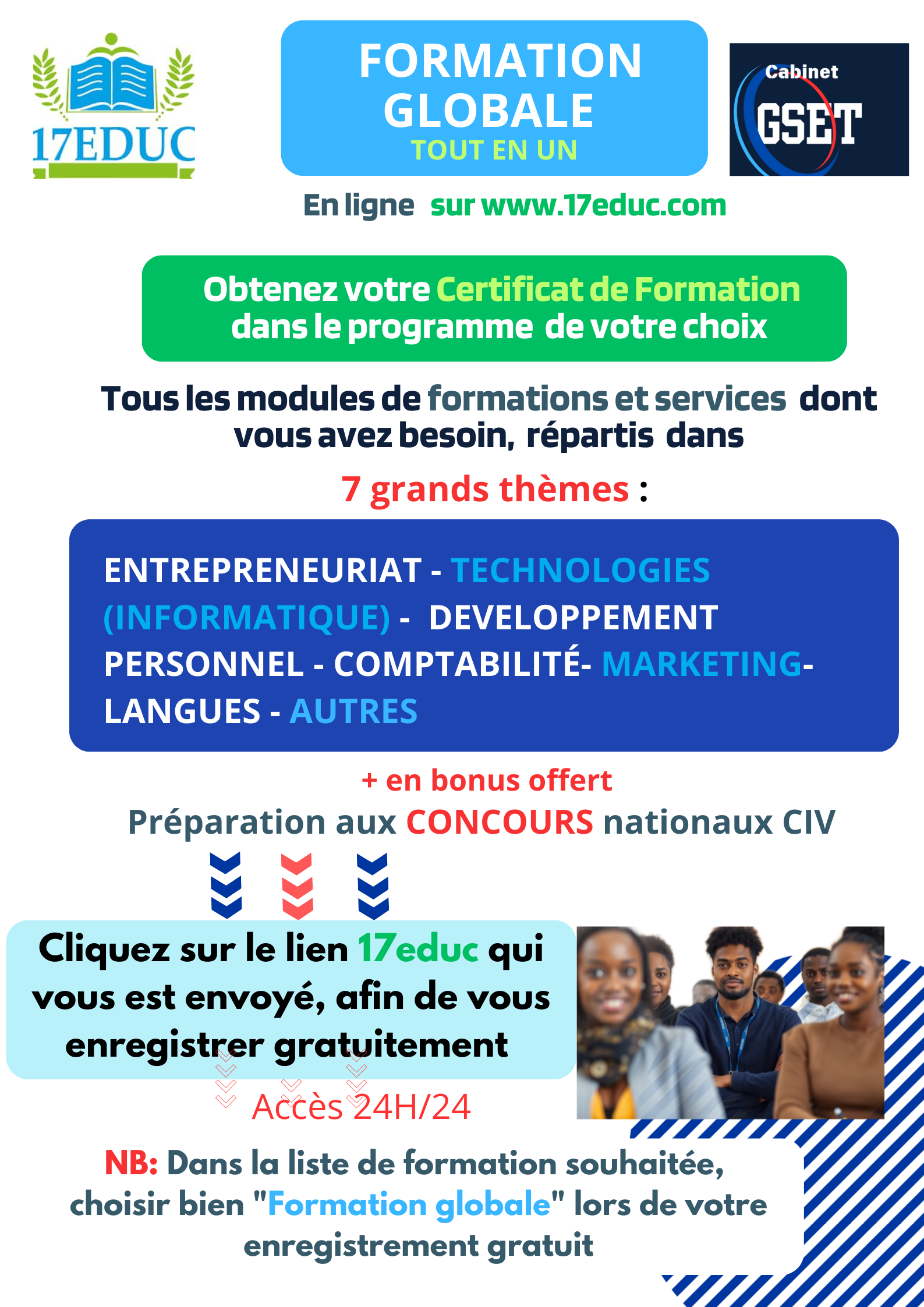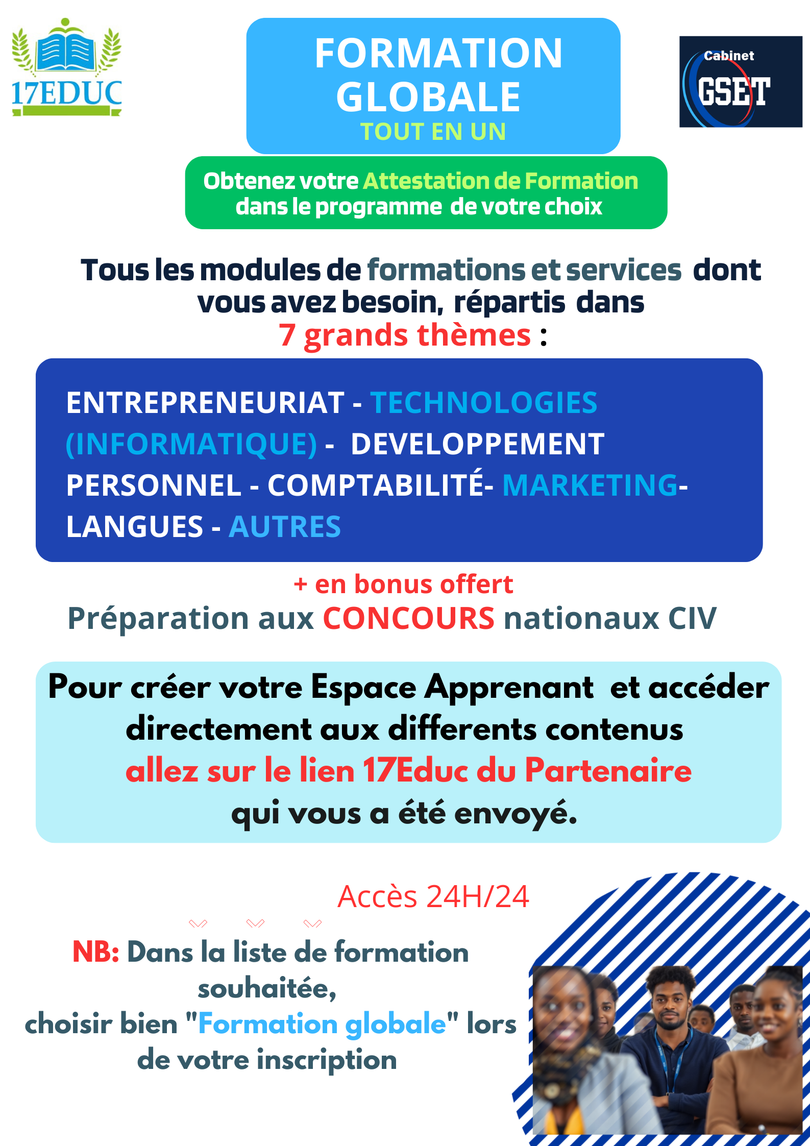Nous vous offrirons bientôt une Formation globale en ligne, dans l'entreprenariat, la Vente, les Langues étrangères, La Comptabilité, Le E-commerce, Les TIC, La Communication et bien d'autres domaines.
